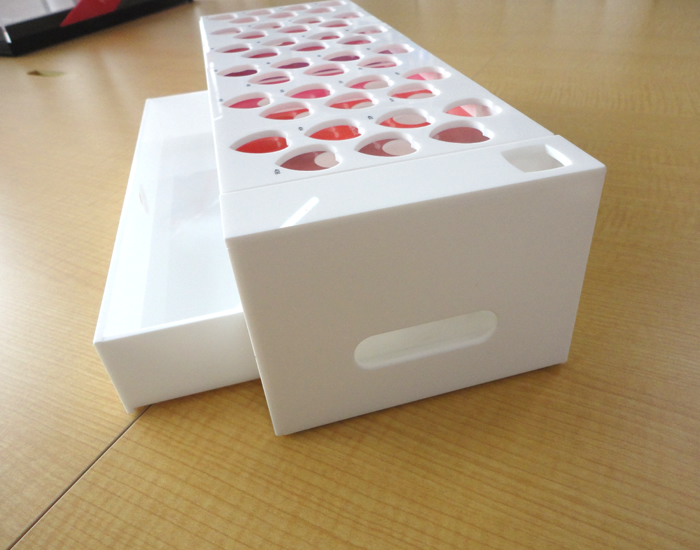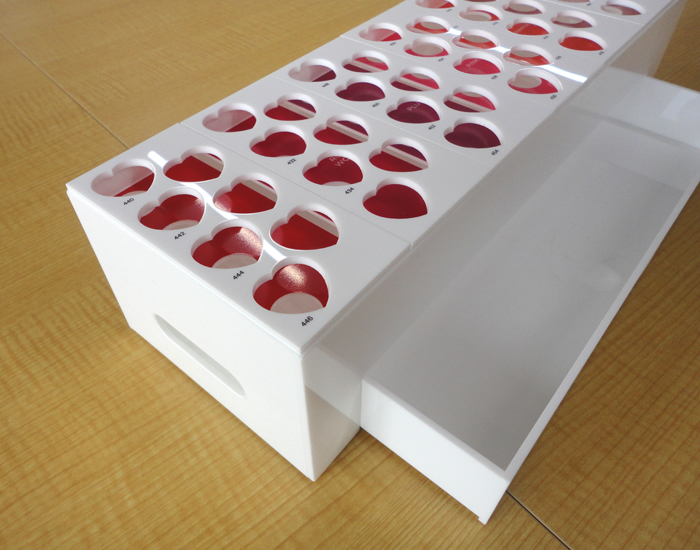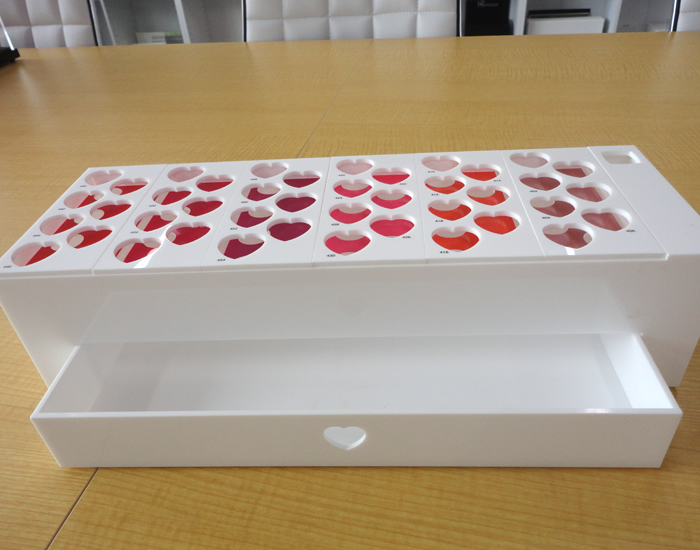 口紅立て、数十種類展示する事が可能で持ち運びしやすい。引き出しにストックを入れることが可能。