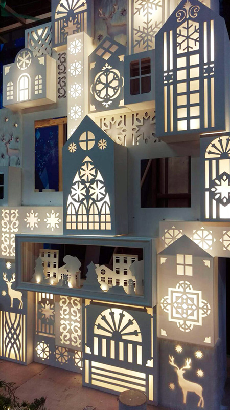 クリスマスイベント用に作製したディスプレイです。レーザーでアクリルをくり抜き、切絵のような雰囲気を持たせています。