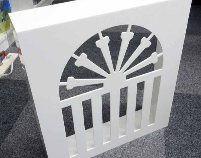 スポーツ用品店でブランドのコーナーを表示するサインボードです。ロゴをレーザーでカットし、立体的に表現しています。