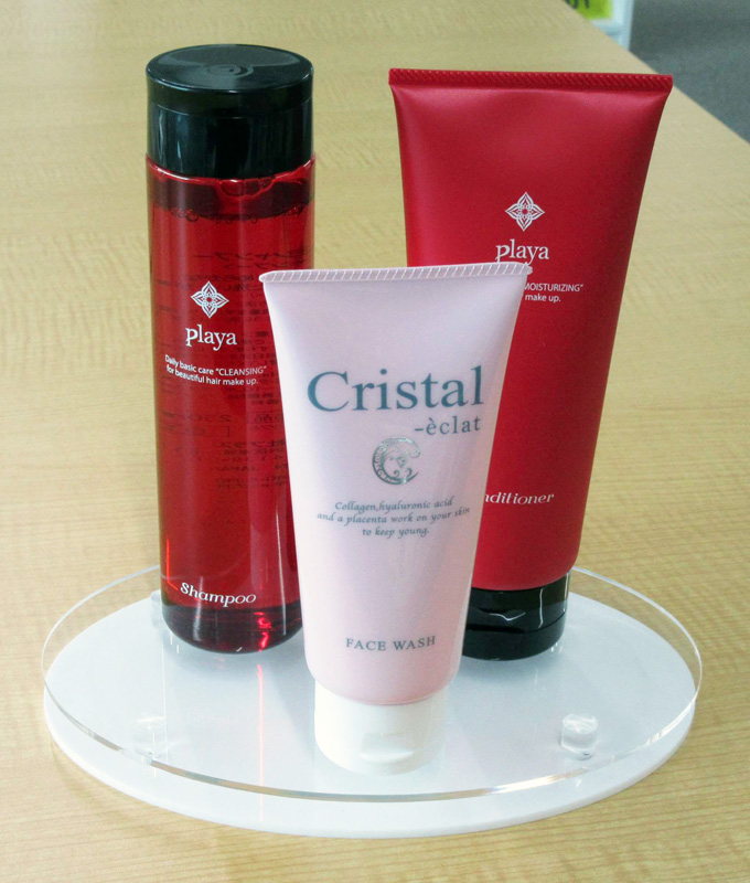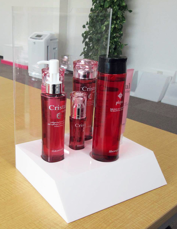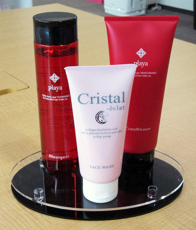 美容室に展示する化粧品のスタンド什器です。季節ごとに変わるものは汎用性のある楕円形で、常設のものは化粧品の形状に合わせて窪みを付けたステージタイプにするなど、工夫を凝らした作品です。